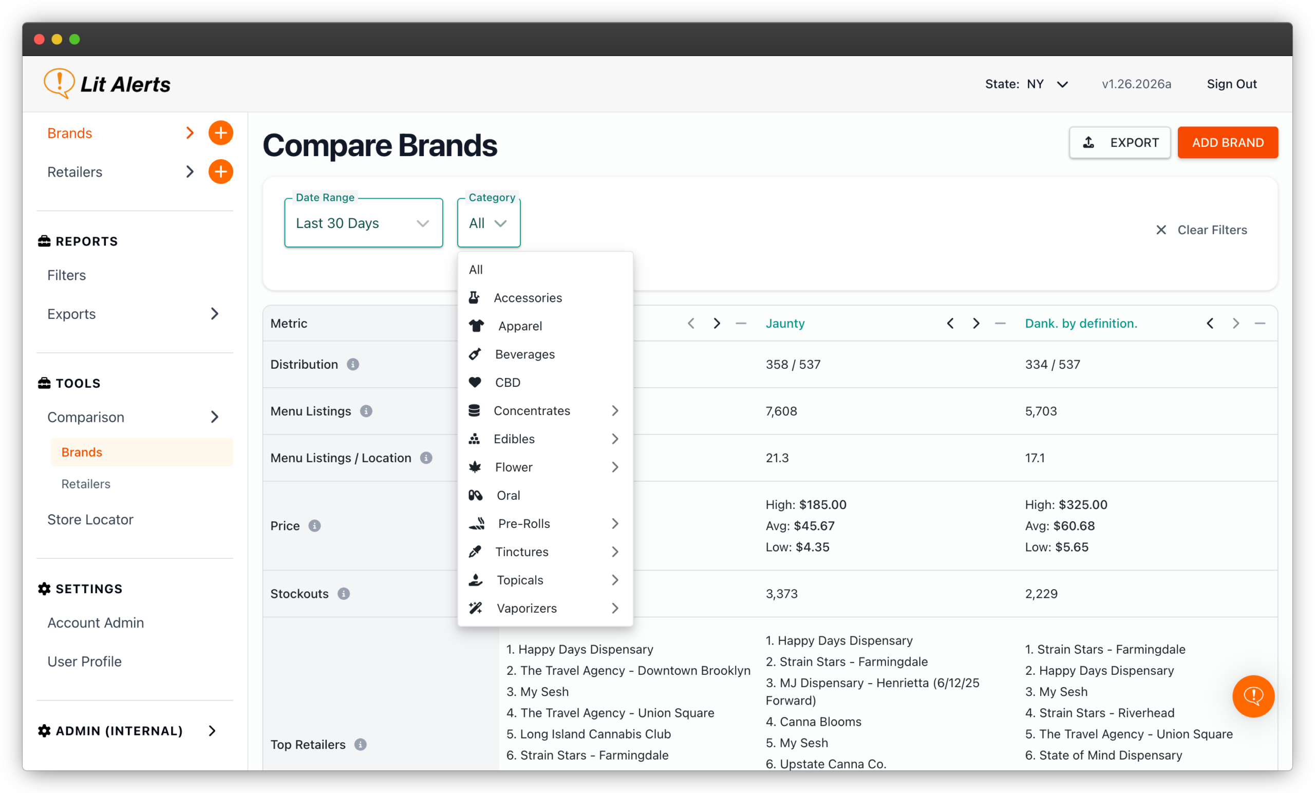 Easily compare brands and retailers side by side for key metrics like total menu items, avg sales prices, inventory changes and even compare lists of top brands, top products and product mix.